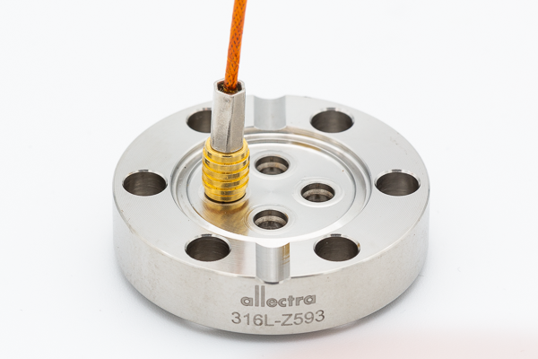 Allectra bietet eine UHV-M12-Durchführung mit UHV-kompatiblem Steckverbinder an. Für weniger anspruchsvolle Anwendungen können HV- und Standard-Steckverbinder auf beiden Seiten verwendet werden.